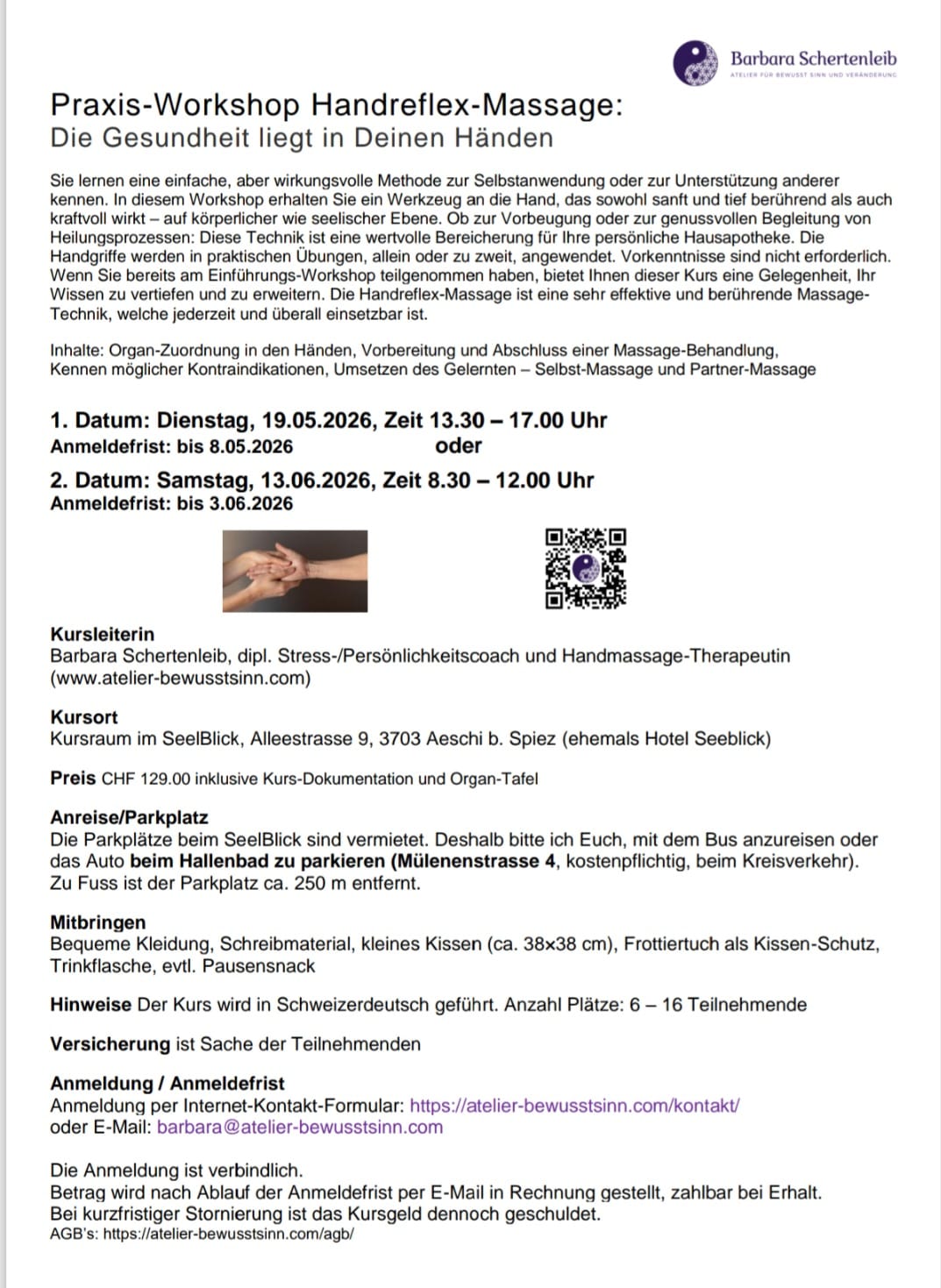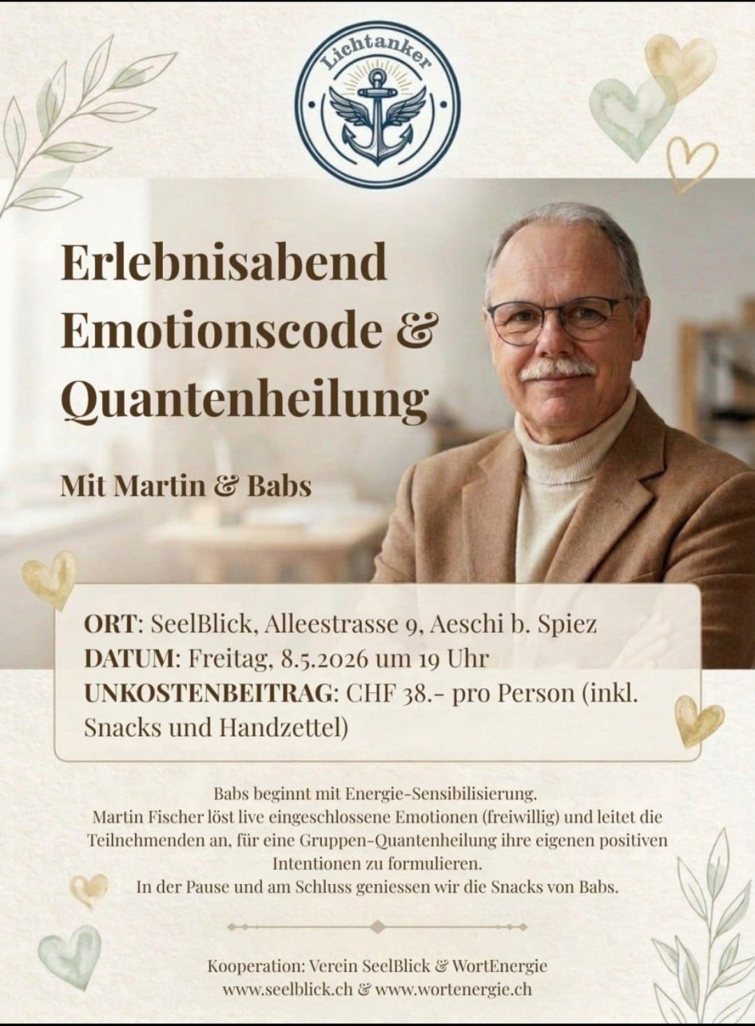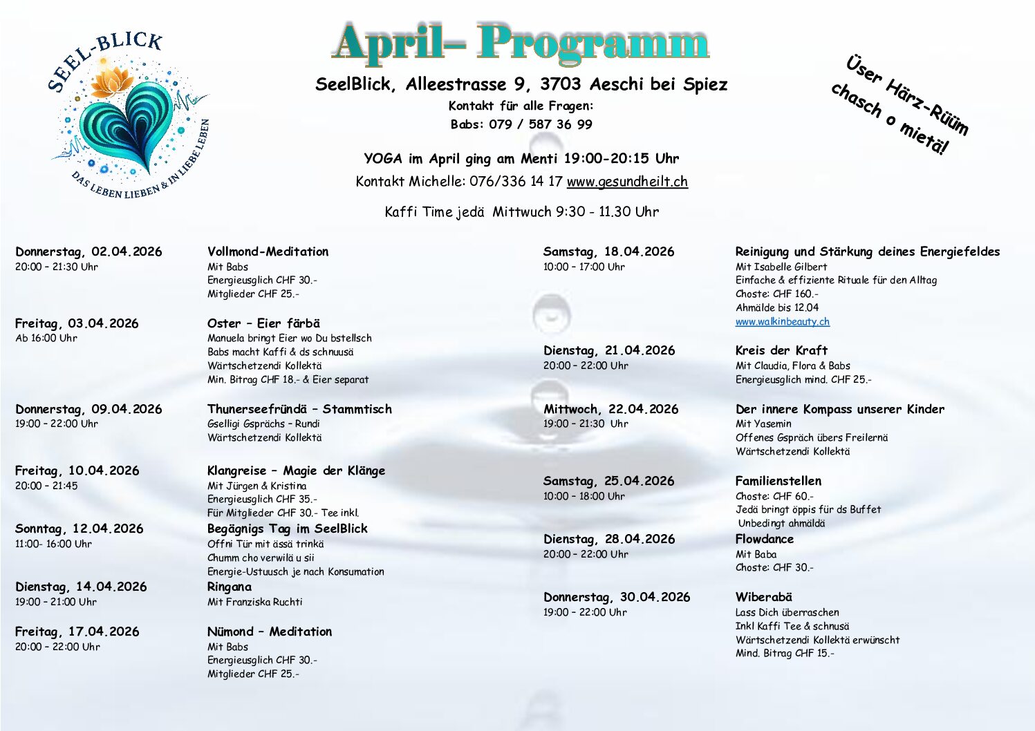Aktuelle Events im SeelBlick Dienstag, 21.04.2026 Kreis der Kraft Mittwoch, 22.04.2026 Der Innere Kompass unserer Kinder Dienstag, 28.04.2026 Energie Flow Dance Ausblick Mai Freitag, 08.05.2026 Emotionscode & Quantenheilung Samstag, 09.05.2026 Psy-Day-Dance Dienstag, 19.05.2026 Kreis der Kraft Dienstag, 19.05.2026 Praxis Workshop Handreflex Massage